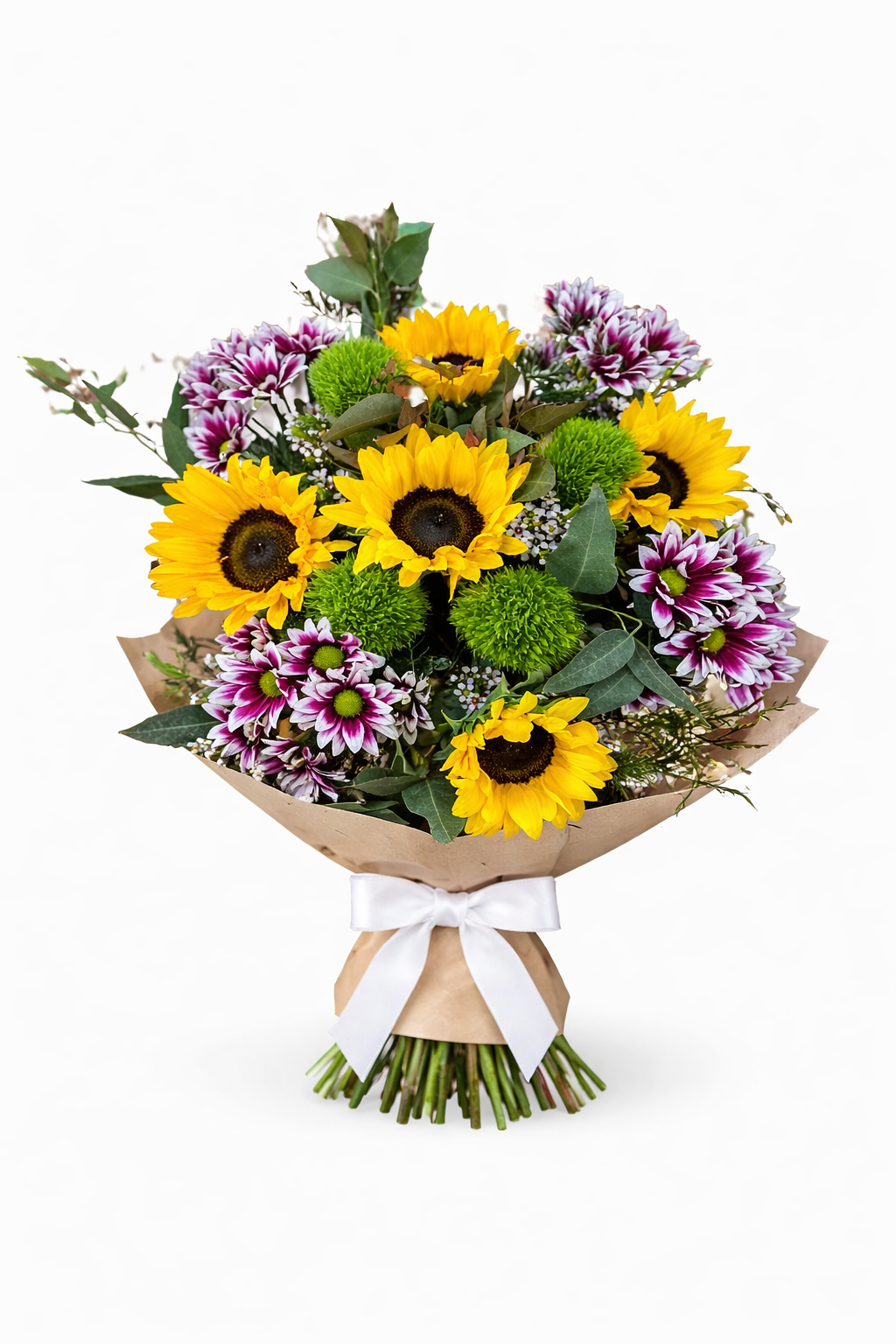 מה בפנים? חמניות גדולות ומרשימות, חרציות צבעוניות וירק משלים – בהרכב מרענן שמשתנה לפי מה שהכי טרי וזמין ביום ההזמנה.