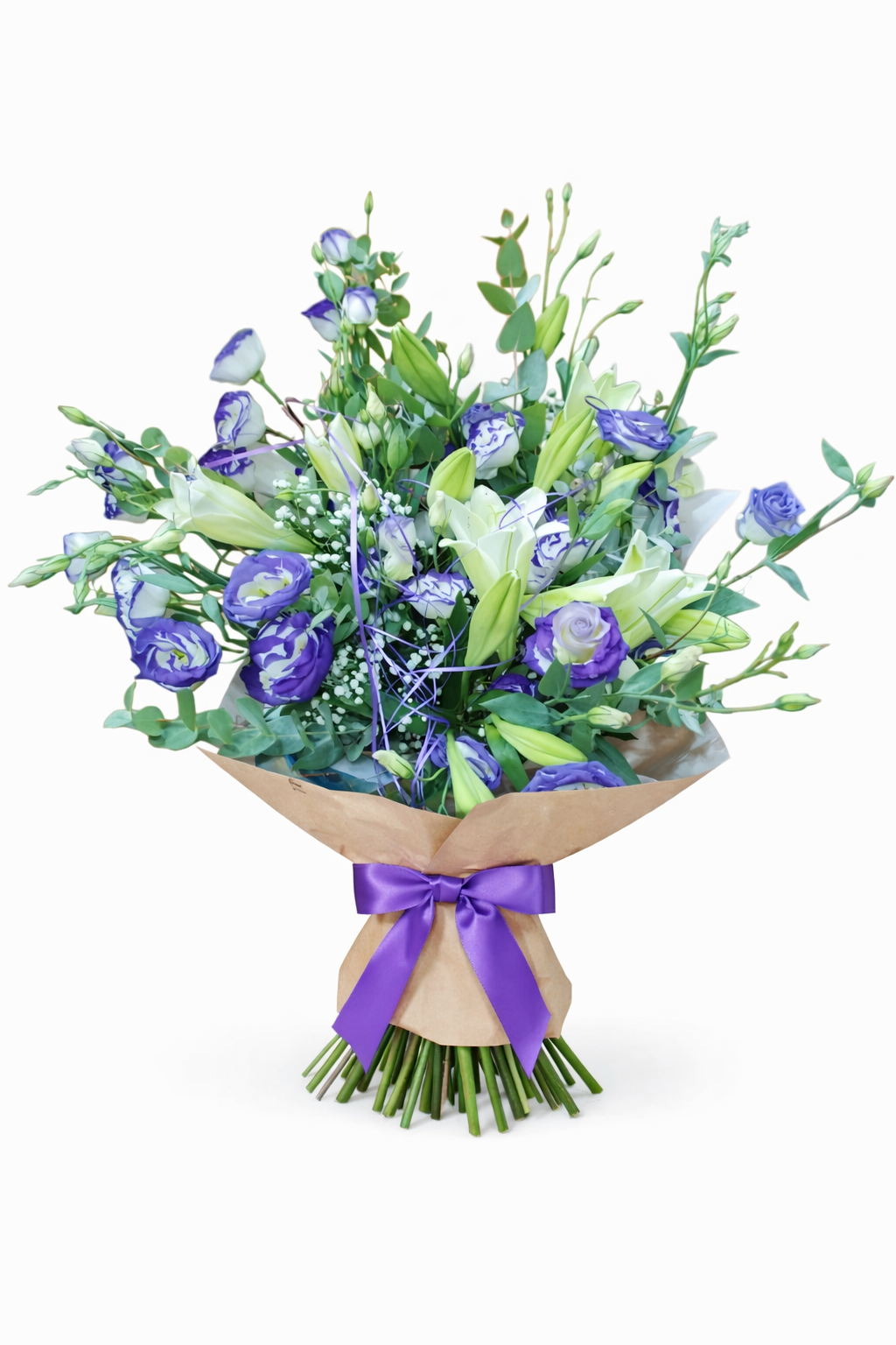 זר בצבעי סגול לבן מרשים ומיוחד.